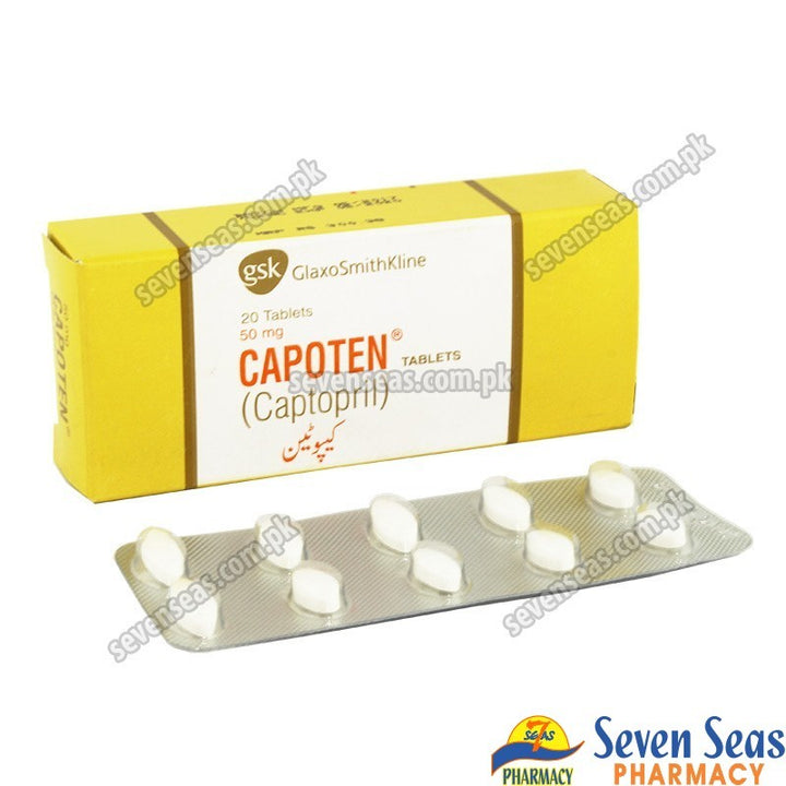 CAPOTEN 50mg Tablet contains Captopril 50mg, an angiotensin-converting enzyme (ACE) inhibitor used to treat high blood pressure (hypertension), heart failure, and kidney problems related to diabetes. It works by relaxing blood vessels, making it easier for the heart to pump and improving blood flow.