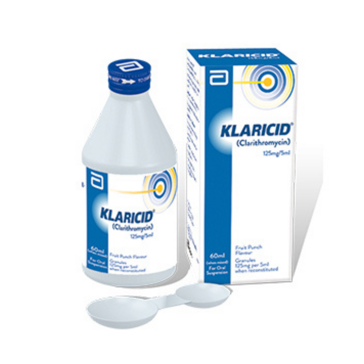 Klaricid Granules contains Clarithromycin 125 mg per 5 ml when reconstituted into 70 ml of suspension, ideal for pediatric and adult use in a 60 ml bottle format