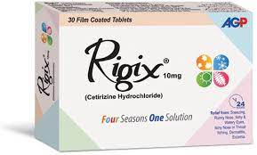 Rigix 10 mg Tablets contain Cetirizine Dihydrochloride, a second-generation antihistamine used for fast and effective relief from allergic symptoms such as sneezing, runny nose, itchy/watery eyes, skin rashes, and hives. Known for its non-drowsy formula, Rigix provides 24-hour protection from both seasonal and chronic allergies with a single daily dose.