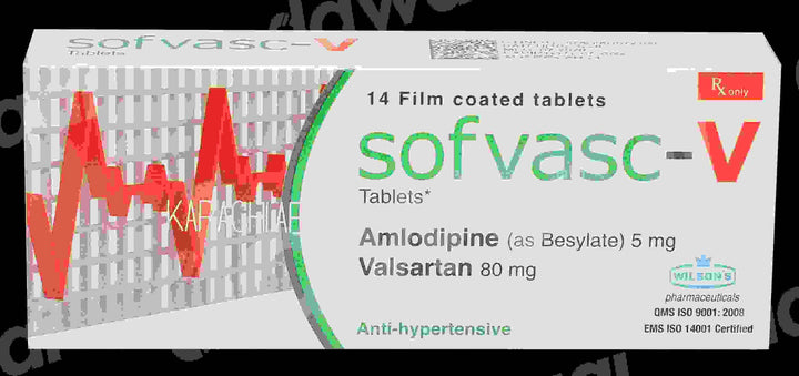 Sofvasc V Tablet is a fixed-dose combination medicine containing Amlodipine 10mg (a calcium channel blocker) and Valsartan 80mg (an angiotensin II receptor blocker – ARB). It is prescribed for the management of high blood pressure (hypertension). This dual-action therapy helps relax blood vessels, improve blood flow, and reduce the workload on the heart.